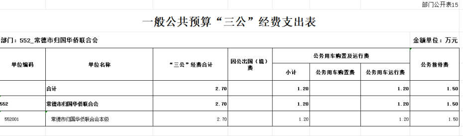 索引号: 所属主题: 三公经费 公开责任部门: 发文日期: 2025-03-05 常德市侨联2026年一般公共预算“三公”经费支出情况预算表 来源: 发布时间:2026-01-25 09:31:13 点击次数: 次 【字体:小 大】 分享到: 【打印正文】 相关内容