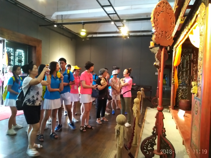 上午9点,营员们来到桃花源,分两条线路分别游览了桃花源。桃花源境内古树参天,花草芬芳,有石阶曲径、亭台碑坊装点,宛若仙境,让营员们大开眼界。在桃源工艺艺术博物馆,一件件精美的木雕、石雕、刺绣、铸器艺术品,让人惊叹,营员们争着与其合影,感受中华文化的博大精深。随后,营员们又游览了桃花山、桃源山天宁书院、水府阁等景点。